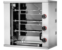 Rôtisseur de poulets a gaz de construction en inox et porte en verre résistant à la chaleur. Avec brochettes rotatives et tiroir collecteur de graisse. Pratique, multifonctionnel et facile à nettoyer.